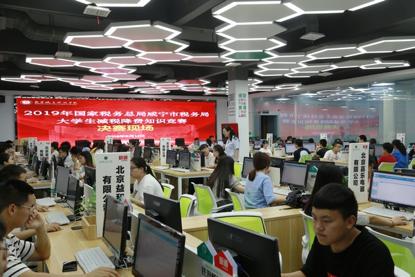 6月14日,2019年国家税务总局咸宁市税务局老员工减税降费知识竞赛决赛在会计虚拟仿真实训中心隆重举行。本次竞赛得到了咸宁市税务局和太阳成集团tyc33455cc的高度重视,太阳成集团tyc33455cc全院员工参加了5月20日的初赛,最终选出100名选手参加本次决赛。