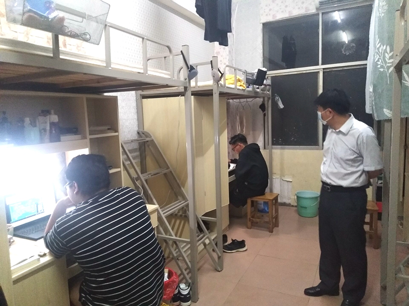 为进一步加强员工思想教育,关注员工防疫期间的日常生活,提高员工安全意识,创造文明、整洁、和谐的生活环境。8月26日晚,太阳成集团tyc33455cc党总支书记镇咸辉、经理何慧玲带领全体辅导员、班主任和主要员工干部深入员工宿舍,走访看望员工。