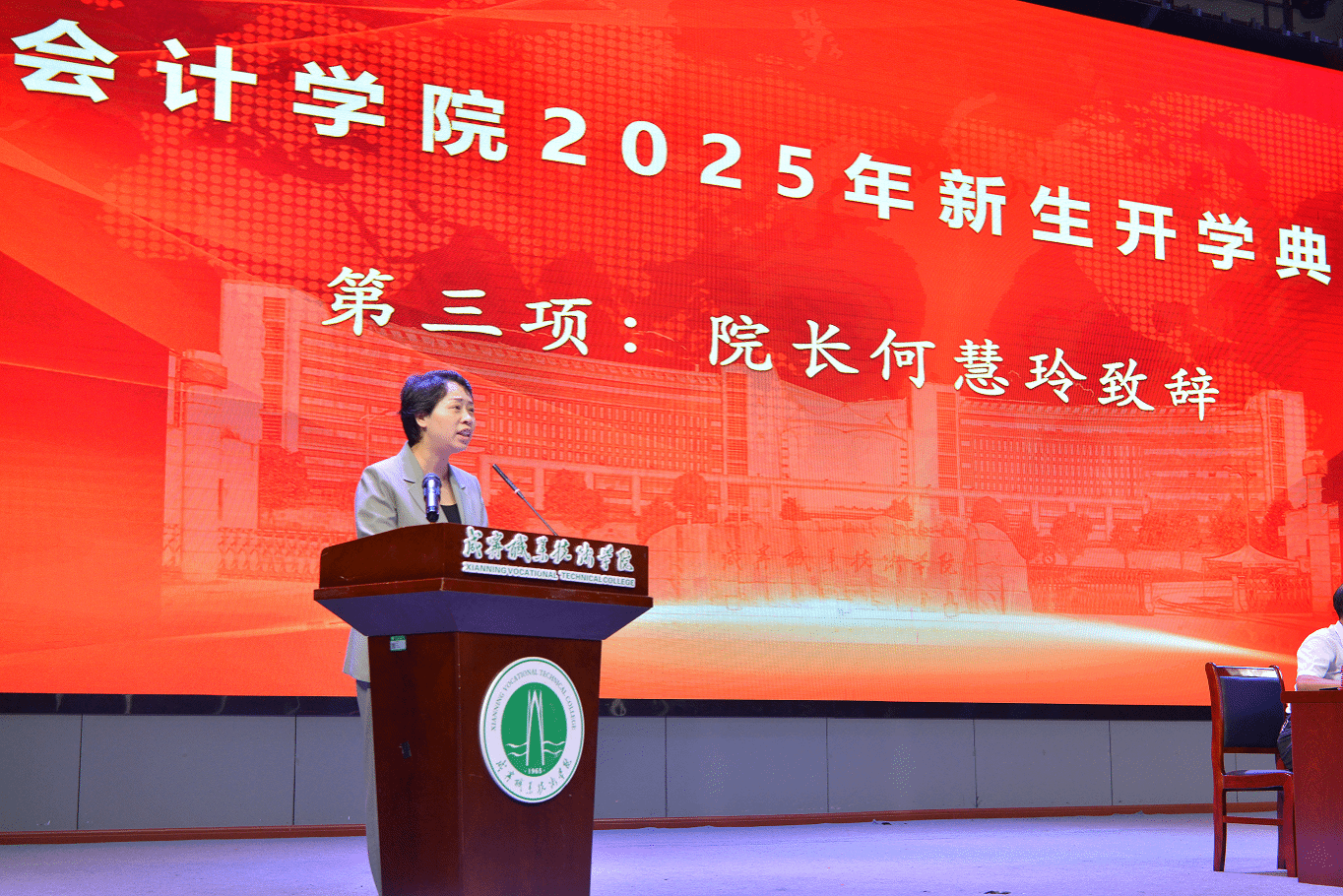 教师代表陈序老师在发言中向新生们表达了全体教师的欢迎与期待。她表示,老师们将恪尽职守,倾囊相授,做同学们学业上的引路人和成长中的良师益友。她希望同学们能够保持好奇心和求知欲,主动学习,善于合作,培养独立思考和解决问题的能力。